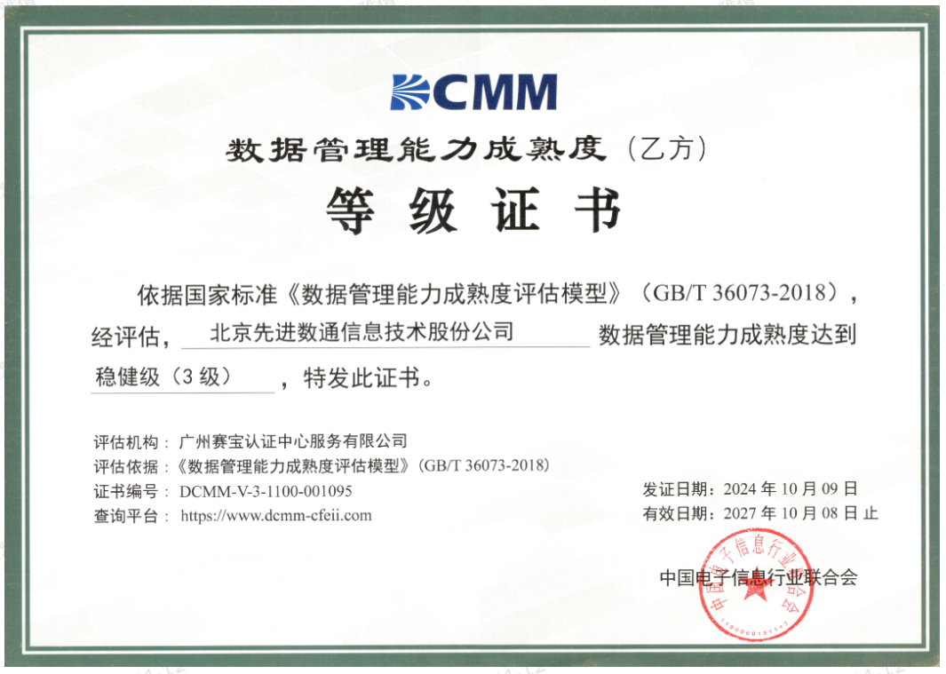 近期,中国电子信息行业联合会公布了最新一批顺利获得数据管理能力成熟度(DCMM)贯标等级认证的企业名单。保利国际 保利成功取得数据管理能力成熟度稳健级(三级)认证。这一认证的取得,标志着保利国际 保利在数据治理体系构建和数据管理与应用能力方面,已经达到了国家权威组织认可的标准。这不仅是对保利国际 保利在数据管理领域专业能力的肯定,也是对其在有助于数字化转型服务和数据驱动决策方面所做努力的认可。